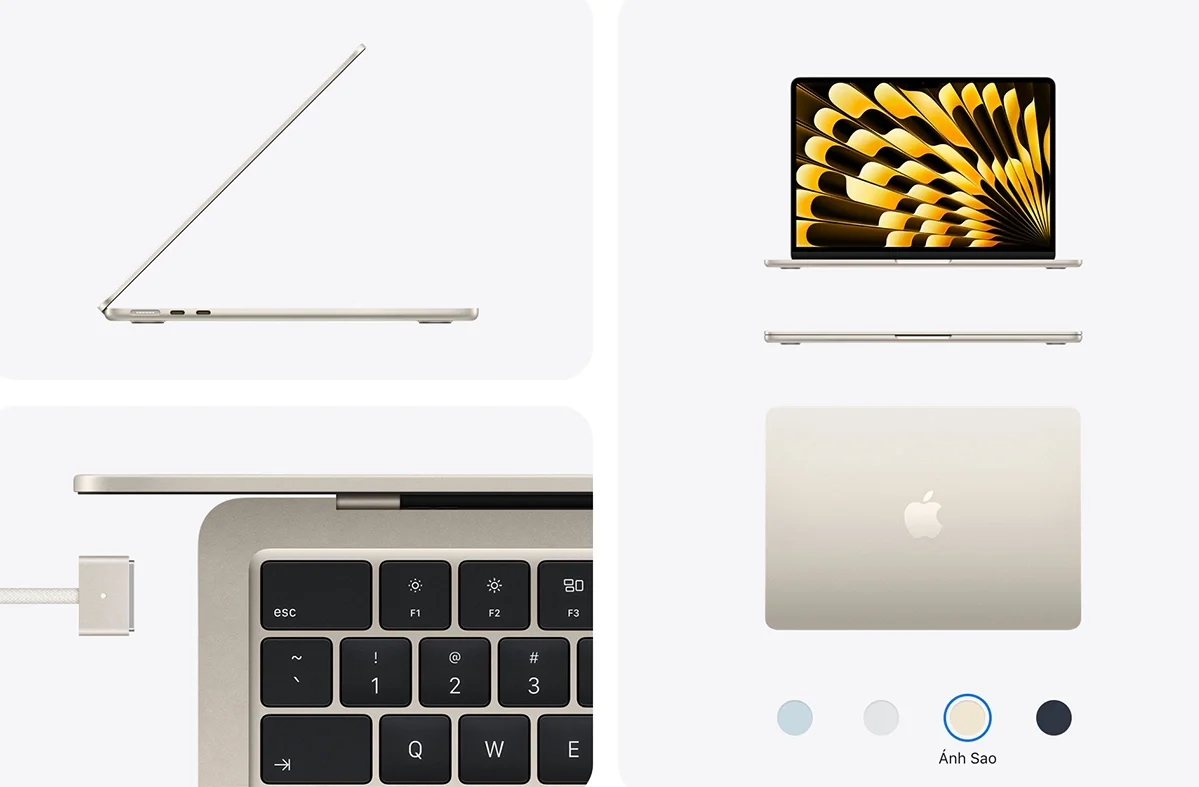 Về ngoại hình, MacBook Air M5 tiếp tục duy trì phong cách thiết kế đặc trưng của dòng Air với khung nhôm nguyên khối được làm từ 100% vật liệu tái chế. Máy có bốn tùy chọn màu sắc gồm: Xanh Da Trời, Đêm Xanh Thẳm, Ánh Sao và Bạc.